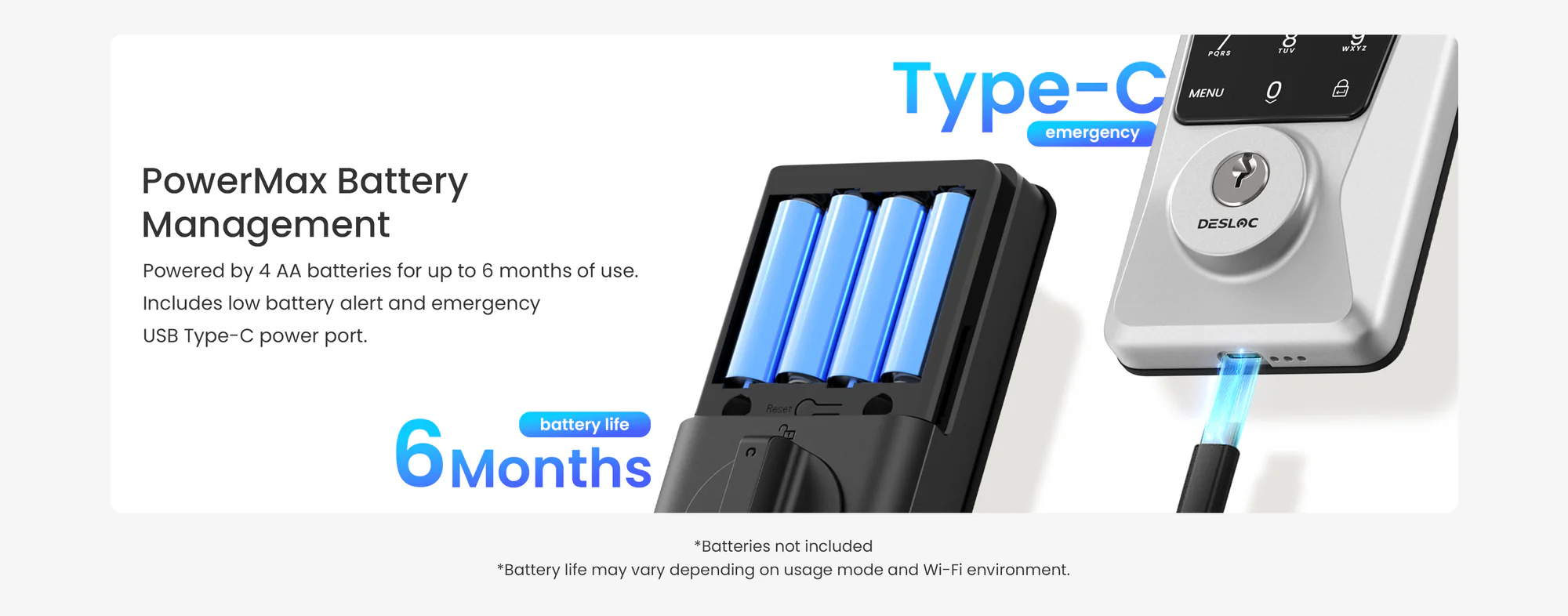 The DESLOC D110 Plus Built-in WiFi Smart Lock is more than just a traditional lock; it represents the best WiFi door lock available on the market. Powered by 4 AA batteries, this smart lock delivers up to 6 months of reliable performance. Users can enjoy peace of mind with low-battery alerts, ensuring they are never caught off guard. Additionally, the USB TYPE-C emergency port provides a backup option, allowing for quick access in case of an unexpected power failure. With its advanced features, the DESLOC D110 Plus Built-in WiFi Smart Lock truly redefines home security.